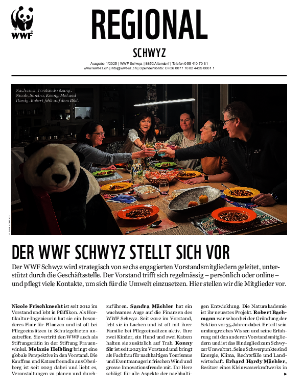 Seit 2025 erscheint zweimal im Jahr eingeheftet im Magazin des WWF Schweiz die Regionalbeilage Schwyz. Dieses gehtan alle WWF-Mitglieder im Kanton Schwyz. Das WWF Magazin Regional berichtet über aktuelle Projekte, Angebote und News des WWF Schwyz.